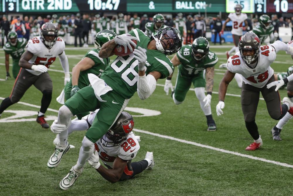 The Jets took a two-touchdown lead on Ty Johnson’s 1-yard run that capped their opening drive of the second half. After Brown’s exit and Brady’s TD to Brate, Ryan Succop kicked a 27-yard field goal to cut New York’s lead to 24-20 with 7:36 left.