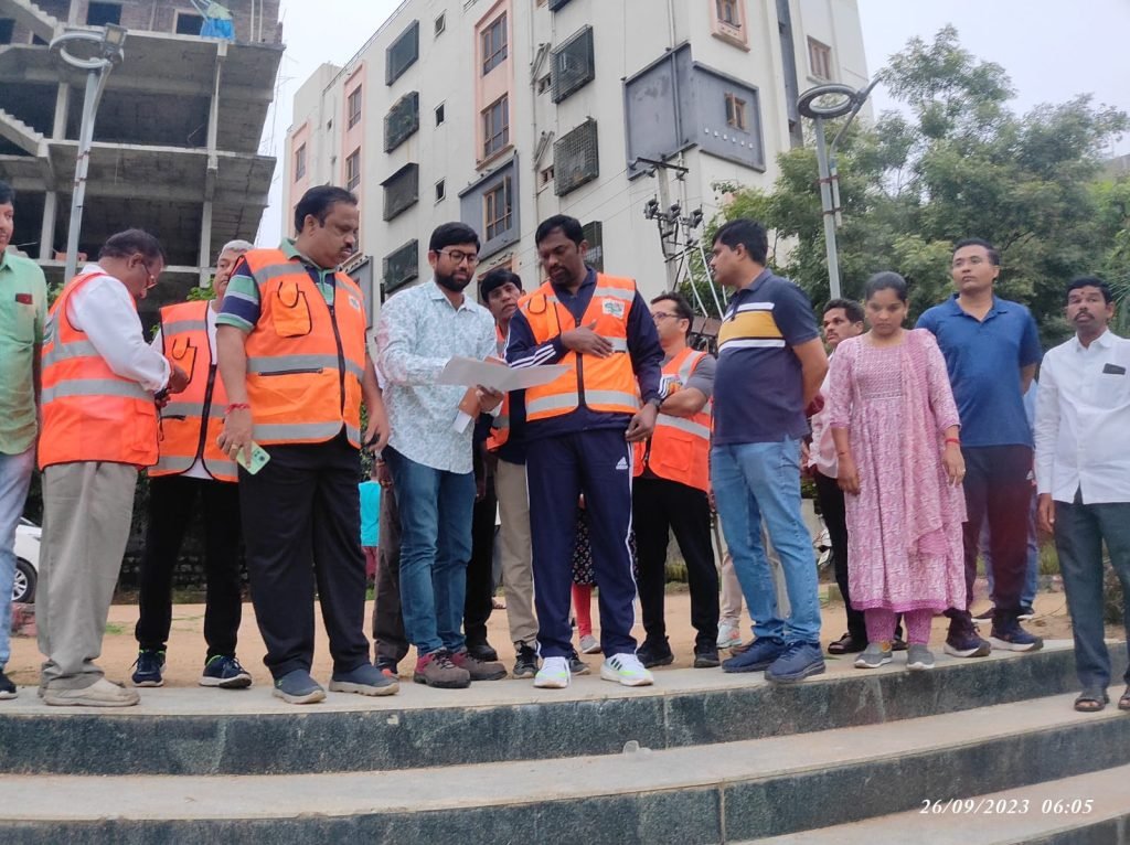 Commissioner, inspected Chintha Kunta park, the morning walkers in the park have complained that the sewage water is flowing inside the park causing foul smells to the nearby residents, and requested to divert the sewage water from entering the park. The Commissioner instructed the EE concerned to look into the matter and rectify the defect and also to provide other required facilities. Later he visited the Janapriya Apartments Hyderguda area and instructed the engineering officials to lay footpaths to avoid encroachments on both sides of the road.